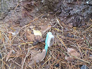 なんだか犬に掘り返されたようで斜めにぶっ倒れておりましたが、確かにあの時の歯ブラシでした。