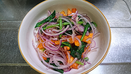 白和え用に塩茹でした小松菜の一部に細切りにした柿とレッドオニオンのスライスを合わせて、塩とレモン汁を加えて混ぜ合わせ、仕上げにオリーブオイルを回しかけております(^^)