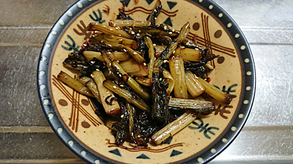 冷蔵庫で発酵し過ぎていたすっぺー野沢菜を干しエビと合わせてごま油で炒めた“野沢菜のごま油炒め”だったので、