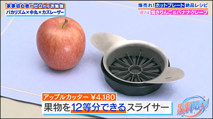 先週、テレビ朝日系の深夜番組「家事ヤロウ!!!」でホットプレート料理を特集した時に、材料のリンゴを一発でくし切りにできるアイテムとして、似たような「アップルカッター」なるモノが紹介されていてすご~く気になっていたのですが、