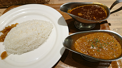 今日は“『湯島 デリー』のカシミールカレー”と“『神保町 インドカレー カーマ』のキーマカリー”がセットになった“2店盛り”の“Aセット”を注文しました(^-^)