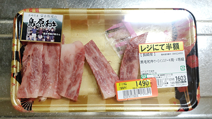 それからさらに、オープニングセールの目玉ともいえる、半額の“島原和牛のサーロインステーキ用”を狙って精肉売り場に行ってみたら、なんとこちらもおつとめ品でさらにちょっくらお安くなっていたので、買ってきてしまいましたよ♪